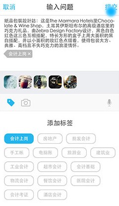 提问:图文+语音+行业标签,让你能尽可能详细地描述问题并将它发送给该标签名师抢答!