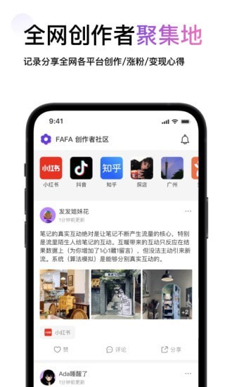 FAFA是专为全网各平台内容创作者提供的交流平台。在这里,你可以记录分享全网各平台创作/涨粉/变现心得,也可以和其他内容创作者在不同的圈子里吐槽爆料。此外,创作者可以通过FAFA定制自己的创作者名片,一个页面整理和直达全网各平台帐号、展示代表作品,让多平台创作的你拥有独一无二的身份。