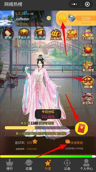 点击底部的『升星』,这里是一个有点类似山海经玩法的模块。先点击下图所示的『快速聚能』,等十几秒再点击旁边的红包领取奖励。下一步点击右上角的『兑换』去换取红包提现