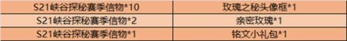 【全新赛季】完成新赛季征程活动送全新头像框新赛季开启,参与活动提升分路战力、参与匹配/排位赛等可获得S21峡谷探秘赛季信物, 使用信物可兑换全新【玫瑰之秘】头像框、亲密玫瑰等好礼。