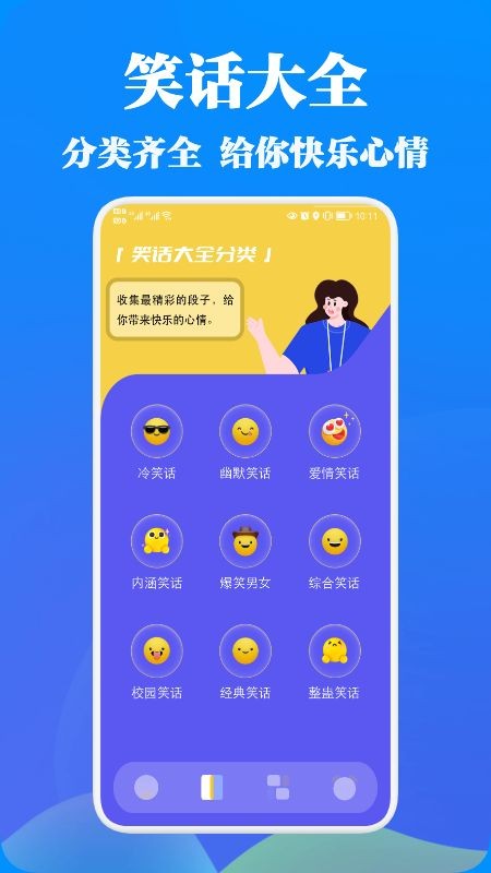 幽默段子app是一款分类齐全的笑话段子软件,每天给你带来快乐,这里的各类段子很全面,用户可以更好的知晓最全的笑话,搜罗全网热点笑话、短视频、GIF动图等优质内容,每天只要看上一分钟,就能开心的笑上一整天,把所有不愉快的事情抛之脑后!