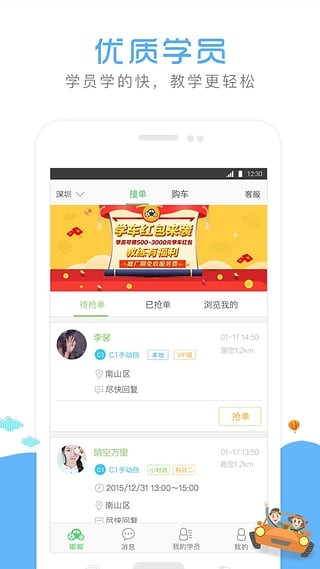 教练抢单:根据地理位置匹配,学员发布学车任务时,即可根据自己实际授课能力抢单。