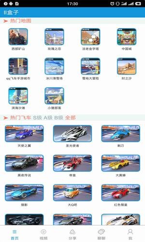 【首页】包含飞车内容数据如地图、S\A\B各级别车、新手快速入门指导等内容;
