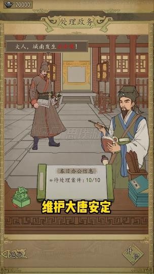 文字策略养成游戏.游戏以隋末唐初架空故事为大背景,你将作为一名出生寒门的小生,经历层层筛选,在严格的科举考试中脱颖而出,初入朝堂,什么都不懂,要从最基础的处理政务做起,步步为营,利用自己的智慧步步高升,最后还天下一个太平!