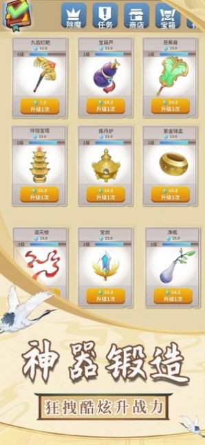 1.休闲放置体验。不肝不氪,诸神法宝尽收囊中。