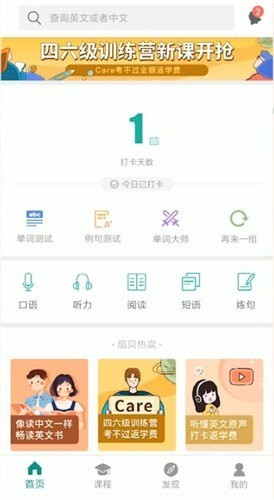 v5.3.4同学们在家也要努力学习噢~1、四六级训练营,智能规划学与练,告别盲目备考,一次帮你搞定四六级。2、考研英语训练营,应届生、在职党的备考福利,2小时内容1小时搞定,讲练结合,省时高效。