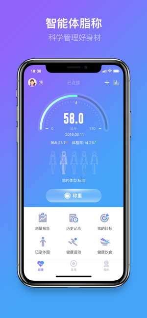 通过享睿app连接蓝牙智能秤,您可以管理实时了解管理您的体重、体脂、身体水分、肌肉含量等多项参数,全面关爱您的健康。