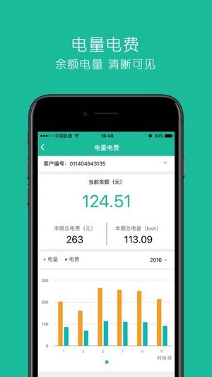 2、电量电费:展示近1年的用电总量及明细,以便用户掌握用电情况。