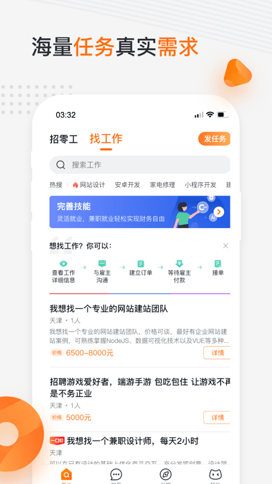 3、丰富的工作资源划分,其中有网站设计、安卓开发、家电维修以及小程序开发等多种分类;