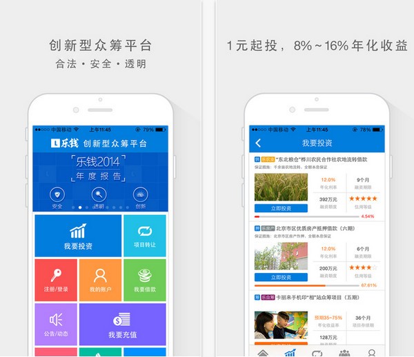 乐钱网app是一款创新型众筹手机应用,乐钱网app致力于为投资人提供合法、安全、透明的互联网理财服务,为个人、中小微企业提供高效、低成本的融资服务。