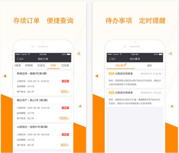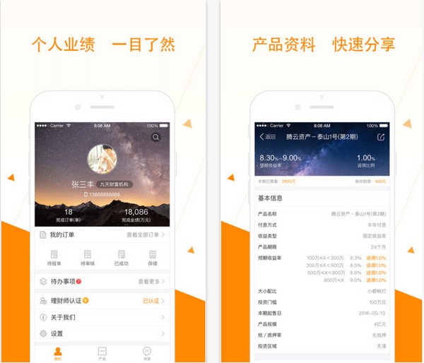 3. 针对理财师人群提供集在线签约、存续管理、新增认证、认购产品等一系列移动互联技术,帮助理财师移动执业和智能办公,提高工作效率。