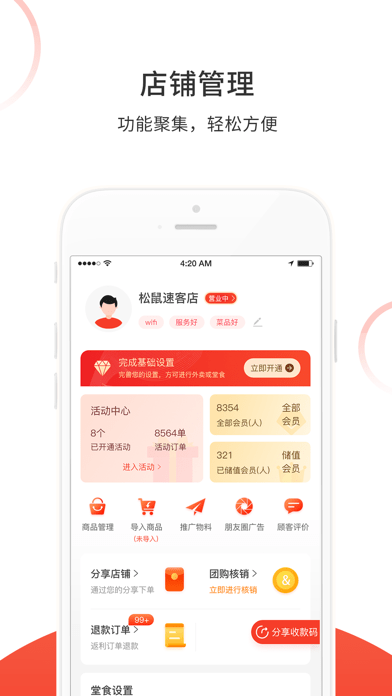 4、多种管理功能聚合在松鼠速客app,可让商户经营店铺更明了。