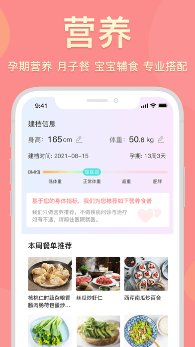 基于孕妈妈填写的建档信息,计算出科学的BMI(身体质量指数)值,针对不同 BMI值,推荐不同的营养食谱,真正做到千人千面,个性营养推荐,让孕妈妈及宝宝更健康;
