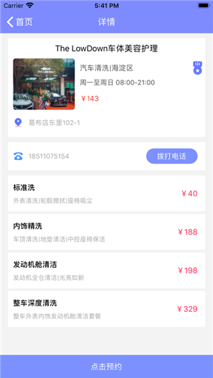在在途洗车软件中可以查看不同洗车店的多种洗车服务:标准洗、精洗内饰、清洗发动机舱和整车清洗等,
